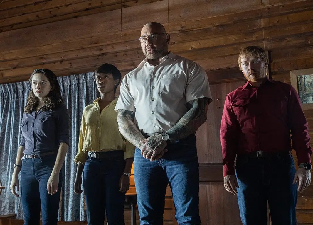 This movie basically asks the question, if you had to choose one of your family members to kill or the apocalypse will happen, what will you do? Eric (Jonathan Groff), Andrew (Ben Aldridge), and Wen (Kristen Cui), encounter this question when they are taken hostage by Leonard (Dave Bautista), Sabrina (Nikki Amuka-Bird), Adriane (Abby Quinn), and Redmond (Rupert Grint). These four people say they have seen visions of an apocalypse and only if Eric, Andrew, and Wen choose to kill one of themselves it will stop.